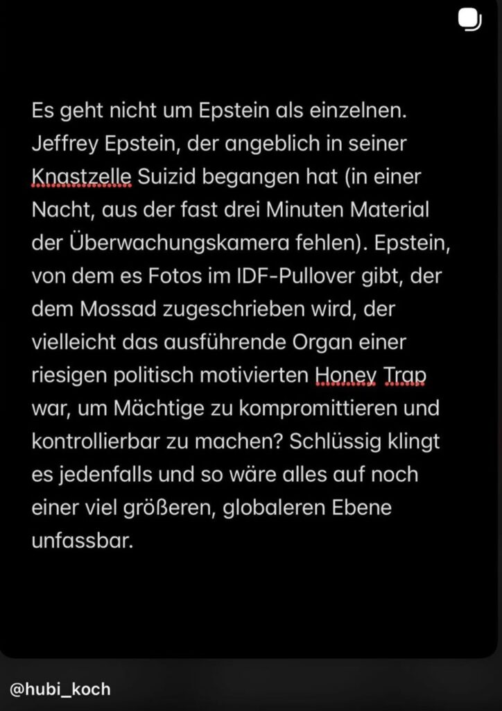 Zudem wies Koch darauf hin, dass Epstein einmal einen Pullover der “Israel Defense Forces” (IDF) getragen habe und ihm Verbindungen zum israelischen Geheimdienst “Mossad” nachgesagt würden. Der Filmemacher spekulierte auch, dass hinter dem Epstein-Skandal eine sogenannte “Honigfalle” des Mossad stecke, mit der Mächtige kompromittiert und kontrollierbar gemacht werden sollten. In der Kommentarspalte des Posts wurde Koch kritisiert, antisemitische Narrative reproduziert zu haben. Hinterher editierte er die Caption und schrieb dort, es könne auch der russische Geheimdienst dahinterstecken.
