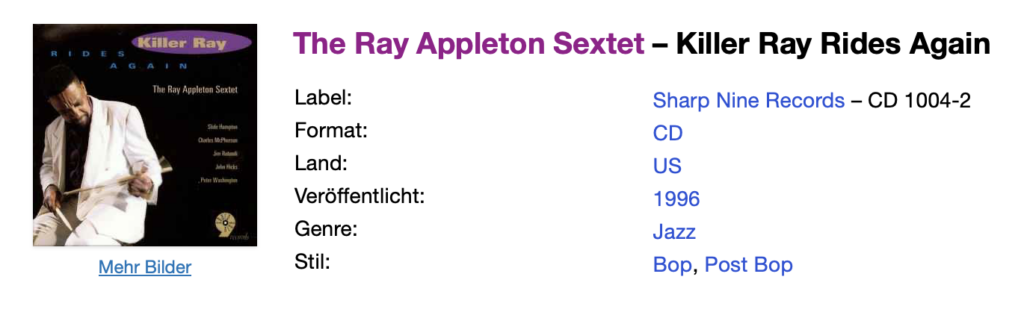 An Bass und Trompete haben wir zwei Herren, die 30 Jahre jünger sind. Auch in ihren Diskografien befinden sich bekannte Namen, die ihre Teilnahme auf dieser Platte rechtfertigen, aber sie scheinen keine Superstars zu sein. Das ganze hier soll ja auch keine Detektivarbeit und keine akademische Studie werden, deswegen grabe ich da nicht tiefer, sondern halte fest, dass Ray Appleton sich zwei Veteranen im Rentenalter und zwei Profis, die halb so alt sind, in sein Sextet geholt hat. Das finde ich schon mal sympathisch. Es wird ferner noch ein Percussionist angegeben, will ich der Vollständigkeit halber ergänzen.